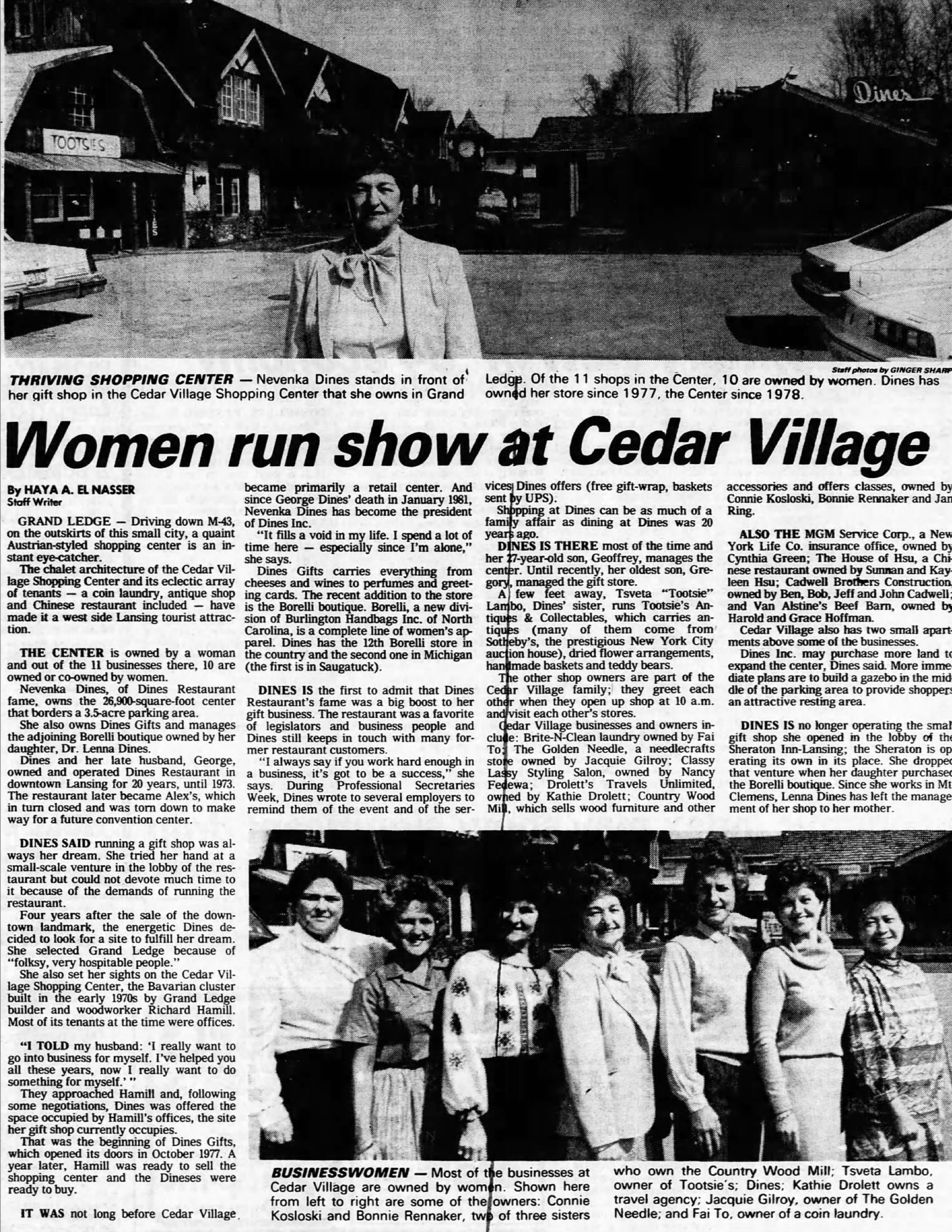 In 1978, Dines Inc. acquired Cedar Village Shopping Center, a distinctive, chalet-style retail plaza in Grand Ledge. Under the family’s ownership, Cedar Village became a hub for small businesses, housing an eclectic mix of shops, services, and restaurants while maintaining its unique architectural charm. Nevenka Dines, alongside her family, played a hands-on role in managing the center, ensuring it remained a welcoming space for both entrepreneurs and the community.